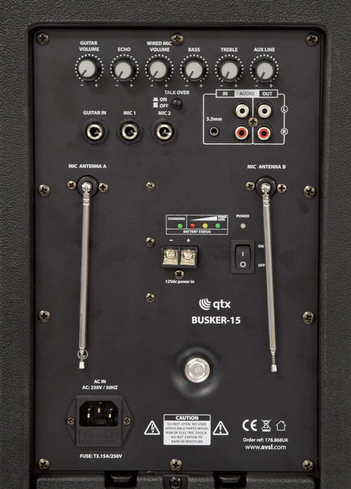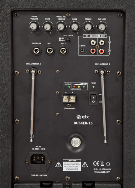 QTX Busker-15 PA + 2 x VHF mics + USB/SD/FM/BT