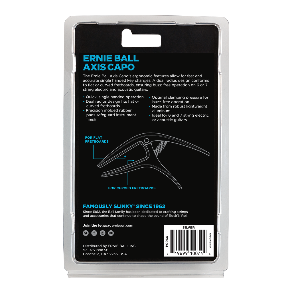 The Ernie Ball Axis Capo's ergonomics features allow for fast and accurate single handed key changes. A dual radius design confirms to flat or curved fretboards ensuring buzz-free operation on 6 or 7 string electric and acoustic guitars.