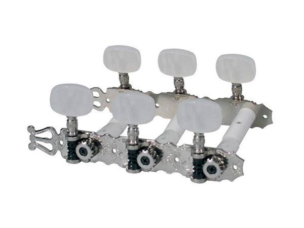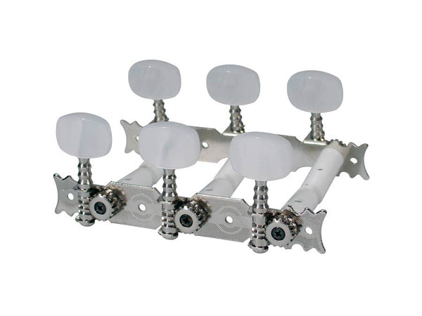 Machine heads for classic guitar, nylon shaft, 3x left+3x right, 70mm, nickel, pearloid buttons