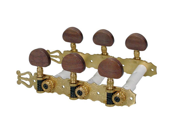 Machine heads for classic guitar, nylon shaft, 3x left+3x right, 70mm, solid brass, wood buttons