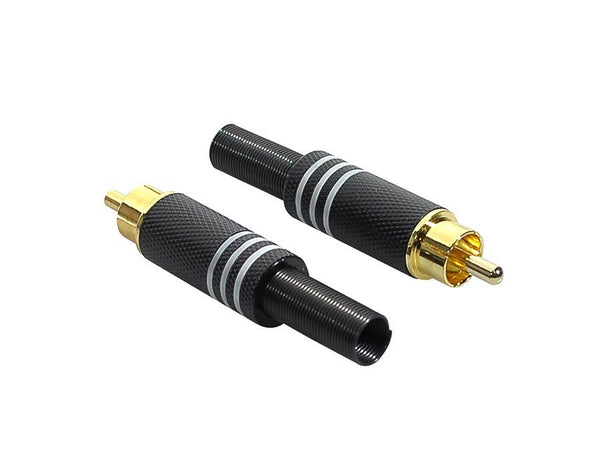 RCA plug, male, metal black, 2 pcs, spring 6,2 mm, gold contacts, black ring