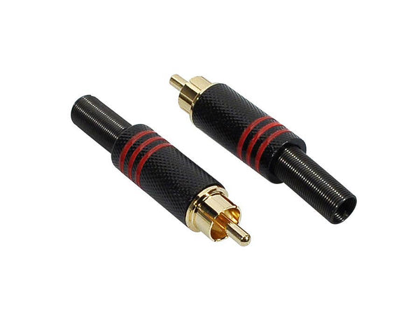 RCA plug, male, metal black, 2 pcs, spring 6,2 mm, gold contacts, red ring